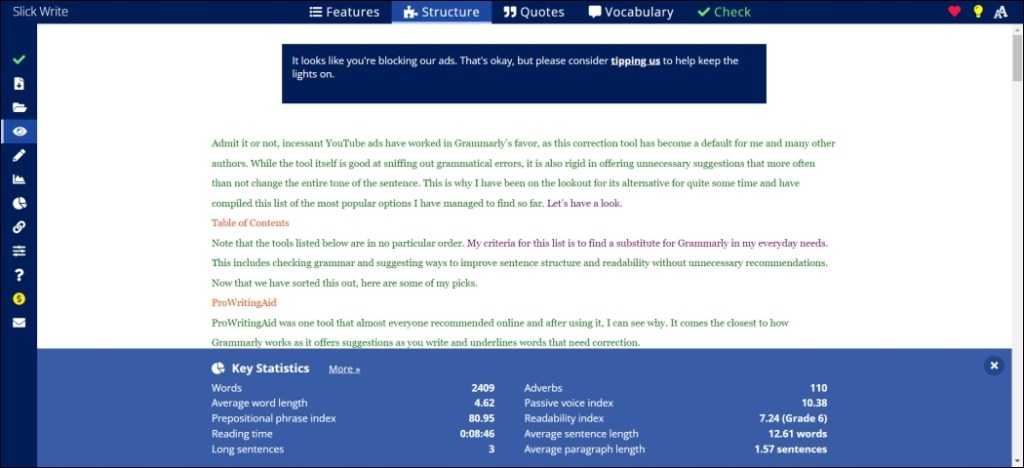 Slick Write is the second last online tool in this list not because it is bad but because, unlike other tools that correct your mistakes, it critiques them instead. This caters to those who want to improve the writing, grammar, and readability of their sentences.